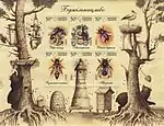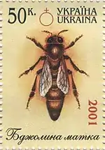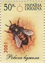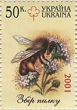 Блок (малий аркуш) «Бджільництво»: Збір пилку Апітерапія Робоча бджола Бджолина матка Вулик Трутень. с укр. — «Блок (малый лист) «Пчеловодство»: |