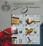 Блок «Гетьманські клейноди та особисті речі Богдана Хмельницького»: Прапор. Військовий музей, Стокгольм; Булава. Музей війська польського, Варшава; Шапка. Національний музей історії України, Київ; Водосвятна чаша. Державний історичний музей, Москва; Кухоль. Фундація князів Чарторийських, Краків; Шабля. Фундація князів Чарторийських, Краків. с укр. — «Блок „Гетманские и личные вещи Богдана Хмельницкого“: