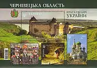Серія «Краса і велич України»: блок «Краса і велич України. Чернівецька область»: «Успенський собор (1900—1908), с. Біла Криниця», «Печера „Попелюшка“, с. Подвірне», «Фестиваль Маланок, м. Чернівці», «Хотинська фортеця (XIII—XIX ст.), м. Хотин». с укр. — «Серия „Краса и гордость Украины“: Черновицкая область: