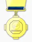 Знак при помощи звена соединяется с колодкой трапециевидной формы размером 43 x 50 мм, изготовленной из медно-цинкового сплава марки Л90 с золочением. Колодка обтянута синей муаровой лентой шириной 24 мм. По краям ленты — серебристые полосы шириной 2 мм.