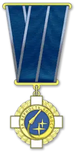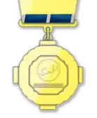Знак отличия при помощи звена соединяется с колодкой трапециевидной формы размером 43 х 50 мм, изготовленной из медно-цинкового сплава марки Л90 с золочением. Колодка обтянута синей муаровой лентой шириной 24 мм. По краям и в середине ленты – серебристые полосы шириной 2 мм.