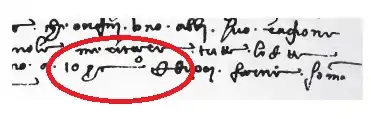 В XV веке аббревиатуру стали записывать как «pc» с небольшим кругом в конце, обозначающим конечную букву -o (в итальянском на неё оканчивались числительные, например primo, secondo и так далее). Первые употребления обнаружены в дополнениях к тексту 1425 года, вероятно, сделанных около 1435 года.[3]