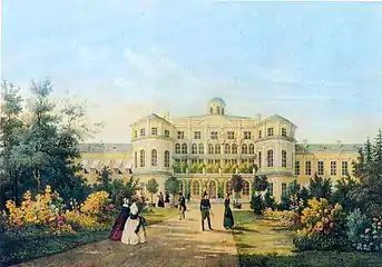 «Знаменский дворец близ Петергофа». Литография К. К. Шульца с оригинала И. И. Мейера. 1845.