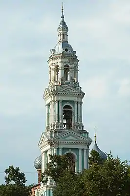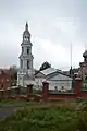 Вид на Знаменский монастырь с бело-голубым храмом иконы Божией Матери "Знамение" с колокольней с юго-восточной стороны