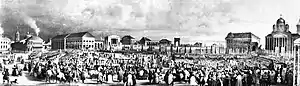 Другим художественным изображением Знаменского собора является литография «Вынос иконы» Бишебуа, Адама и Бушо 1839 года[19], выполненная в Париже с оригинала Ф. А. Джунковского[121], один из экземпляров которой хранится в Государственном Русском музее. На литографии запечатлена Красная площадь Курска в день выноса из Знаменского собора иконы «Знамение» перед началом крестного хода в Курскую Коренную Рождество-Богородичную пустынь. Сам Знаменский собор расположен в правой части литографии, причём изображение его имеет явные неточности: видна лишь одна колокольная башня с тесно поставленными колоннами, а не две колокольни, каждая из которых имела широкие проёмы для свободного колокольного звона, как это было на самом деле[122][123].