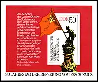 Марка Германской Демократической Республики, на основе фотографии Евгения Халдея «Знамя Победы над рейхстагом»