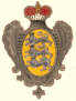 Три льва синие под коронами, да сверху корона, а над нею наверху девица под короною в белом одеянии; поле жёлтое. |