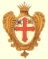 В золотом щите на белом поле красный город с башнями, над воротами которого рыцарь в доспехах, вооружённый мечом и щитом. |