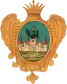 На зелёной земле ворота и две башни красные, в воротах в полумесяце звезда, наверху рогатка, над ним шпага с ключом, а сверху корона. |