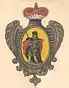 Чёрный орёл одноглавый под короною, в левой ноге крест жёлтый, а корона, нос и ноги жёлтые же. |