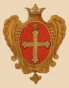 Крест жёлтый под короною, по старому, поле красное. |