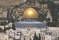- Место, на котором стоял Храм и с которого, по верованиям мусульман, Мухаммад вознёсся на небеса и получил от Аллаха пять столпов ислама, которые по-прежнему используются до сих пор[58]. Абд-аль-Малик отметил это место исламским святилищем Куполом Скалы, впоследствии приобретшем религиозное значение, как „женская“ мечеть[59].