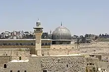 Однако, непреходящее место, занимаемое городом в исламе, связано, главным образом, с историей ночного вознесения Мухаммада (ок. 620 г. н. э.). Мусульмане верят, что однажды ночью Мухаммад был разбужен и чудесным образом перенесен на волшебном скакуне Бураке из Мекки к «возвышенности на краю (الاقصى)» — описание, в котором некоторые толкователи Корана видят Храмовую гору в Иерусалиме. По их толкованию, там он молился, а затем над местоположением разрушенного иерусалимского Храма разверзлись небеса и открылся путь, которым он вознёсся в рай. Там он встречается с предшествующими пророками Ислама (в частности, Авраамом, Моисеем и Иисусом)[45][46][47]. Этот путь привёл Мухаммада к трону Бога, однако ни ему, ни сопровождавшему его ангелу Джабраилу (Гавриилу) не было дозволено вступить в запредельные области. И хотя непосредственно в Коране название «Иерусалим» не упоминается[48], — равно как и его арабская версия «Аль Кудс», — исламские тафсиры (комментарии) интерпретируют первый аят суры Аль-Исра и двадцать первый аят суры Аль-Маида, как описание Иерусалима. Мечеть аль-Акса («отдалённейшая мечеть»), определяемая первым аятом суры Аль-Исра, как конечный пункт путешествия Мухаммада[49], толкуется, как Храмовая гора в Иерусалиме. В 21 аяте суры Аль-Маида говорится о священной земле для евреев, фактически утверждая, что Иерусалим предписан Аллахом народу Мусы: