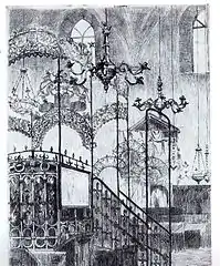 | Вид в прошлом с улицы Бляхарской (ныне Староеврейская) | Рисунок, реконструирующий интерьер | Руины синагоги, следы её куполов на стене соседнего дома |