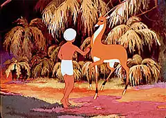 По пути мальчик спасает от кобры птенцов, вытаскивает из ямы двух тигрят, помогает слону, вытаскивая копьё из его ноги. В благодарность животные помогают ему быстрее добраться до антилопы. Узнав причину визита, антилопа даёт ему 10 золотых монет, а также просит сделать из бамбука дудочку, чтоб мальчик мог вызвать её, когда понадобится. В конце, понимая, что мальчик не успеет к положенному ему времени, предлагает подвезти его.