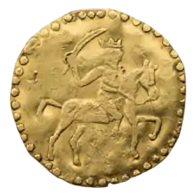 Впервые выпущены в оборот при Василии Шуйском одновременно с золотыми копейками. Выпуск был связан с нехваткой серебра в казне, из-за выплат шведским наёмникам[3]. Стоимость приравнивалась к 10 серебряным деньгам (или 5 копейкам). Золотая соответствовала по облику и весу серебряной. Официально была введена указом Шуйского в мае 1610 года, где говорилось, что монеты предназначены для выплат служилым людям и иностранцам, также они принимались для оплаты налогов и пошлин в казну[4]. Чеканка происходила в Москве. Выпуск продолжался очень недолго из-за свержения Шуйского. Впервые в русской истории золотые монеты были введены в настоящий денежный оборот, ранее золотые монеты чеканились, но использовались как награды и сувениры, но не действительные платёжные средства. Также именно с выпуском золотых монет связывают мятеж наёмников, служивших под командованием шведского военачальника Делагарди, когда после распространения слухов о золоте во время боя войско стало неуправляемым, солдаты обернулись назад, разграбили обоз и разбежались, а Делагарди заключил сепаратный мир с Жолкевским. Встречаются и более поздние золотые деньги — например, времён Михаила Фёдоровича, а также их современные реплики. Обстоятельства их выпуска не ясны.