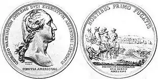 Реверс. Слева – Джордж Вашингтон верхом на коне, в окружении офицеров штаба, указывает рукой на британский флот, покидающий Бостон. Американская армия, выстроенная в боевом порядке перед укреплениями, готовится войти в город. Надписи: лат. HOSTIBUS PRIMO FUGATIS. («Враг впервые бежит»). лат. BOSTONIUM RECUPERATUM XVII MARTII MDCCLXXVI. («Бостон снова занят 17 марта 1776 года»)