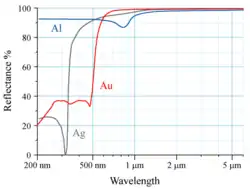Причиной того, что цвет золота отличается от цвета большинства металлов, является малость энергетической щели между полузаполненной 6s-орбиталью и заполненными 5d-орбиталями[17]. В результате золото поглощает фотоны в синей, коротковолновой части видимого спектра, начиная с примерно 500 нм, но отражает более длинноволновые фотоны с меньшей энергией, которые не способны перевести 5d-электрон на вакансию в 6s-орбитали (см. рис.). Поэтому золото при освещении белым светом выглядит жёлтым. Сужение щели между 6s- и 5d-уровнями вызвано релятивистскими эффектами — в сильном кулоновском поле вблизи ядра золота орбитальные электроны движутся со скоростями, составляющими заметную часть скорости света, причём на s-электронах, у которых максимум плотности орбитали находится в центре атома, эффект релятивистского сжатия орбитали сказывается сильнее, чем на p-, d-, f-электронах, чья плотность электронного облака в окрестностях ядра стремится к нулю. Кроме того, релятивистское сжатие s-орбиталей увеличивает экранировку ядра и ослабление притяжения к ядру электронов с более высокими орбитальными моментами (непрямой релятивистский эффект). В целом, 6s-уровень снижается, а 5d-уровни растут[18][19].