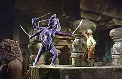 Другая ожившая статуя — богиня в храме дикарей. Коура называет её Кали, но её облик сочетает внешность двух богинь индуистского пантеона: Кали и Дурги. Согласно канону, у Кали четыре руки, у Дурги может быть восемь или больше. В предварительных набросках художник дал ожившей статуе восемь рук, но позже, осознавая сложности в реализации и в съёмках подобного объекта, сократил число до шести. Богиню при постановке сцены с живыми актёрами заменяло до трёх каскадёров-фехтовальщиков. Сцену поединка с ожившей статуей богини большинство критиков назвало лучшей сценой в фильме[18]. В своей весьма негативной рецензии Гленн Эриксон, отметил среди положительных сторон только эту сцену, назвав её демонстрацией «магии Харрихаузена»[19].