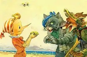 - Базилио — полосатый кот, встреченный главным героем на улице. Его собрат с таким же именем является одним из мошенников.