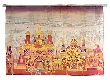 Согласно воспоминаниям Григорьева, Дягилев задумывал задействовать на сцене только балетных артистов и отделить от них оперных исполнителей, поэтому решил поместить певцов к оркестру[10]. Однако этому воспрепятствовал недостаток места, и тогда было принято предложение Гончаровой: «построить на самой авансцене с двух сторон две лестницы в виде пирамид, которые сливались бы с декорацией, и на них поместить певцов и хор, одев их всех в одинаковые боярские костюмы»[11]. Действие оперы-балета разворачивалось по либретто В. И. Бельского[12].