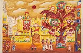 ![]() Н. С. Гончарова. Эскиз декорации для 1 акта опреы-балета «Золотой петушок», 1914. | |