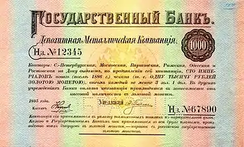 Депозитная металлическая квитанция Госбанка 1000 рублей 1895 (образец)