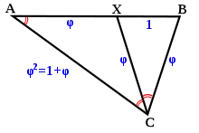Расстояние AX и СX равны φ, что видно на рисунке. «Золотой треугольник имеет отношение основания к стороне, равное золотому отношению φ, в то время как золотой гномон имеет отношение боковой стороны к основанию, равное тому же золотому отношению» [5].