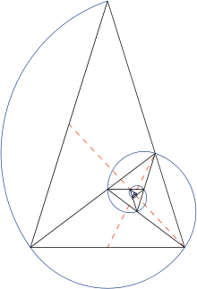 Последовательность золотых треугольников можно вписать в логарифмическую спираль. (Начиная с большого треугольника) делим угол при основании пополам, получаем следующую точку[3]. Процесс деления может продолжаться бесконечно, создавая бесконечно много золотых треугольников. Логарифмическую спираль можно провести через полученные вершины. Эта спираль известна также как равноугольная спираль. Термин предложил Рене Декарт: «Если провести прямую из полюса к любой точке на кривой, она пересечёт кривую всегда под одним и тем же углом»[4].