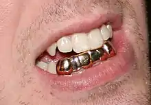 Существуют также съёмные золотые коронки - накладные зубы под названием грилзы, которые имитируют золотые коронки, такие носят рэперы и другие знаменитые люди, а также те, кто им подражает. Существуют также не золотые, но похожие внешне на золото[10].