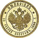 По Указу 16199 от 11 декабря 1898 года[13] чеканили монету номиналом 10 рублей с 1898 по 1904, в 1906, 1909—1911 годах. Указом определены следующие параметры: монета содержит в себе 900 частей чистого золота и 100 частей меди (золото 900 пробы). Лигатурный вес монеты составляет два золотника одна и шесть десятых доли (8,6026 г). Вес чистого золота в десятирублевой монете — один золотник семьдесят восемь и двадцать четыре сотых доли (7,7423 г). Диаметр монеты — 89 точек (22,606 мм). Предельный вес, при котором монета принималась в казну по нарицательной стоимости, определён в два золотника и шесть десятых доли (8,5582 г). В дальнейшем отмеченные параметры были закреплены Монетным Уставом 1899 г.[10]. С 1923 по 1926 годы советское правительство, для осуществления золотовалютной интервенции в рамках поддержки своей новой валюты — червонца, помимо золотого червонца «сеятель», также осуществляло чеканку золотой 10-рублевой монеты царского образца.[1][2] Всего советским правительством было изготовлено 10- и 5-рублевой золотой монеты на сумму 52 622 000 рублей.[11]
