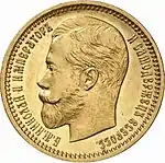 — золотые монеты регулярного чекана, предназначенные для обращения[3] с 1897 г.: 5 рублей, 7 рублей 50 копеек, 10 рублей, 15 рублей;