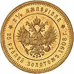 В 1908 году Монетным двором по Высочайшему повелению, возможно к 40-летию императора, был выполнен еще один заказ. Из почти 5-килограммового самородка золота, найденного на сибирских приисках и принадлежавшего кабинету Николая II, были изготовлены 150 экземпляров 25-рублевых монет. По типу оформления монета практически полностью повторяла монету 1896 года, за исключением изменения портрета императора и даты — 1908 год. В 1910 году для Великого князя Георгия Михайловича изготовили еще 25 экземпляров с прежней датой.