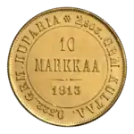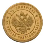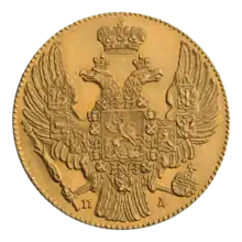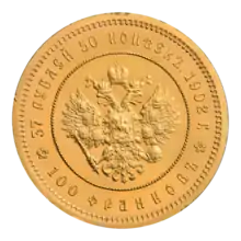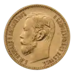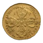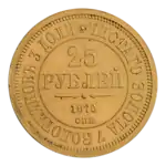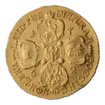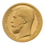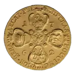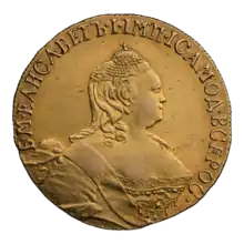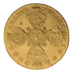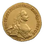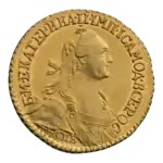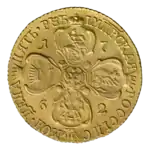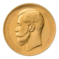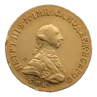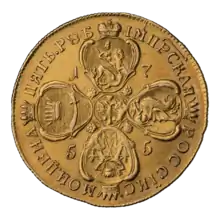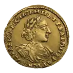 Золотые монеты Российской империи берут своё начало с монетной реформы Петра I, которому удалось создать русскую золотую ходячую монету.[1] Первой золотой монетой стал червонец без указания номинала, отчеканенный на Кадашевском монетном дворе в 1701 году. Создание ходячей золотой монеты было вызвано необходимостью выпуска монет большого номинала, в то время как попытки выпустить серебряные двухрублевики в конце правления Петра I не увенчались успехом.[1]