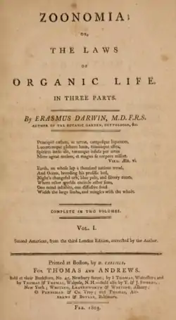 «Зоономия, или Законы органической жизни» (англ. Zoonomia; or the Laws of Organic Life) — труд английского врача и натуралиста Эразма Дарвина, опубликованный в 1794 году в двух томах. Книга затрагивает такие темы, как патология, анатомия, психология и функционирование человеческого тела. В книге присутствуют ранние идеи эволюционного учения, позднее развитые внуком Эразма Дарвина, Чарлзом Дарвином.