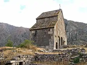 С западной стороны памятника находится традиционный для местной архитектуры открытый гавит-притвор. К тому же раскопки привели к открытию трёх помещений из массивных базальтовых камней: они отличаются анфиладным расположением по оси север-юг. В восточной и южной стенах помещений археологи обнаружили примечательные ниши-хранилища. Открытие множества полок вкупе с данными нишами-хранилищами позволили предположить о возможном размещении здесь средневековых рукописной мастерской и библиотеки (матенадаран)[3]. В то же время с восточной стороны церковь представляет собой традиционную постройку с возвышением посередине с двумя крутыми скатами и с односкатными кровлями по бокам[2].