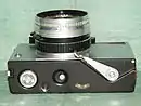 - На нижней крышке камеры расположены органы управления — рычаг взвода и перемотки плёнки (под левую руку), головка обратной перемотки, кнопка обратной перемотки и шкала счётчика кадров.