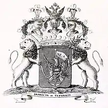 Описание герба: Выдержка из Общего гербовника Герб русских графов Зотовых представляет в щите, имеющем лазуревое поле, переломленный надвое серебряный полумесяц рогами вверх; над ним (в пересечении частей полумесяца) — штандарт с изображением государственного герба и корабля в море. Штандарт этот помещён развернутым над головою одноглавого золотого орла в короне, с распростёртыми крыльями, держащего в правой лапе поднятый серебряный меч, а в левой — лавровую ветвь. На груди орла изображено пламенное сердце, крестообразно пронзённое двумя серебряными стрелами. В нижней части сердца горизонтальная серебряная полоса означает реку, а над нею (в середине сердца) — серебряная же пластинка в ширину (камень) снабжена изображением семи глаз. Щит увенчан графскою короною, над которою три шлема по обычаю. В крайних нашлемниках сверх короны по три страусовых пера, а в среднем над короною — возникающий до половины российский государственный герб. Намёт: справа — червлёный с золотом; слева — лазуревый с серебром. Щитодержцы — львы, из которых стоящий справа держит в правой лапе поднятый обнажённый меч, а стоящий слева — лавровую ветвь. Внизу под гербовым щитом девиз на ленте: «Верность и терпение». Герб рода графов Зотовых внесён в часть 8 Общего гербовника дворянских родов Всероссийской империи, стр. 3. |