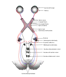 Итак, как отмечалось выше, аксоны ганглионарных клеток образуют зрительный нерв, который передаёт зрительную информацию от глаз в головной мозг. Каждый зрительный нерв располагается сзади от глазного яблока; его длина невелика, причём разные волокна зрительного нерва несут информацию от разных участков сетчатки. Существенно, что зрительные нервы от правого и левого глаз перекрещиваются, образуя частичный перекрёст зрительных нервов — зрительную хиазму, располагающуюся примерно в центре основания коры головного мозга. При этом нервные волокна, идущие от тех участков сетчатки, которые примыкают к носу, ведут в контралатеральное (противоположное) полушарие конечного мозга, а нервные волокна, отходящие от височных отделов сетчатки, ведут в ипсилатеральное полушарие; благодаря этому зрительная информация от каждого глаза поступает в оба полушария[25][26].