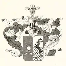 Щит увенчан дворянскими шлемом и короной. Нашлемник: три страусовых пера. Намёт на щите голубой и золотой, подложенный серебром и красным.