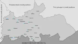 Расположен в юго-восточной части области, на границе с Кемеровской областью.