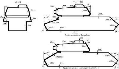 Броневой корпус танка (кроме лобовой детали у части машин) сваривался из катаных броневых плит толщиной 90, 60, 30 и 20 мм. Конструкция лобовой детали варьировала в зависимости от модификации машины: