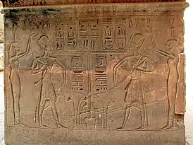 ![]() Слева богиня востока Иабет, в центре два изображения фараона Рамсеса III, справа богиня запада Аментет | |