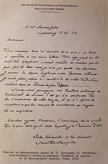 Нужным считаю присовокупить, что большая часть сих переводов вчерне. По возвращении в Отечество я не имел ещё времени, ни способов к окончательному изготовлению оных не было. Впрочем, не теряю надежды, быть некогда полезным Отечеству через свои труды. <…> Остаюсь Вашим покорнейшим и усерднейшим слугою монах Иакинф. Ноября 10, 1824, Валаам[78].