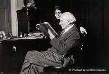 Приняв революцию как свершившийся факт, Вяч. Иванов хотя бы из соображений выживания был вынужден начать искать пути сотрудничества с новой властью. В начале мая 1918 года он поступил на службу в Наркомпрос, возглавлявшийся А. В. Луначарским, с которым поэт был знаком ещё с 1906 года. Благодаря сближению с Луначарским, П. Коганом и О. Каменевой происходил вполне уверенный служебный рост Иванова[148][149]. Позиция Вяч. Иванова нашла отражение в его орфографии: в 1919 году он испросил особое разрешение печатать свои сочинения в старой орфографии, однако в переписке с Луначарским более или менее последовательно пользовался реформированной[150]. С 15 октября 1918 года Иванов являлся председателем бюро Историко-теоретической секции ТЕО Наркомпроса, возглавляемого О. Каменевой, а с 14 июня 1919 года входил в научно-художественную коллегию Центротеатра, в который был преобразован ТЕО, уже под началом самого Луначарского. С декабря 1919 года по август 1920 года он заведовал Академическим подотделом и входил в коллегию ЛИТО, возглавляемую В. Я. Брюсовым. Также Вяч. Иванов служил редактором по отделу литературы и филологии Госиздата, а также подрабатывал, в частности, в бюро по организации Всероссийского съезда рабоче-крестьянских театров, бюро художественных коммун и Музыкальном отделе (МУЗО), организуя концерты памяти А. Н. Скрябина. С 1918 года в Наркомпросе служили жена и дочь Иванова. Служба обеспечивала хорошее по советским меркам жалованье, усиленный паёк, а также материальную помощь по линии ЦЕКУБУ и Пролеткульта, что позволило семье в 1919—1920 годах большую часть времени проводить в санаториях. Однако даже это в условиях разрухи и военного коммунизма не уберегало от катастрофы: в день Благовещения 1919 года скончалась от истощения и тифа М. М. Замятнина, а у В. Ивановой произошло обострение туберкулёза. Лёгочными заболеваниями страдали дочь и сын писателя[151]. Из-за разрушения дома, где Ивановы квартировали, в 1918 году им отвели три комнаты в доме № 4 в Большом Афанасьевском переулке, но зимой 1919 года проблема холода и голода встала в полной мере[152]. Ивановы оказались подселёнными в огромную коммунальную квартиру, кишевшую насекомыми и грызунами; мышей и крыс Вячеслав Иванович боялся как хтонических животных[153].
