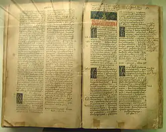 13. Библия. Острог, 1581. 8 ненумерованных + 276 + 180 + 30 + 56 + 78 нумерованных листов пяти счётов, формат не менее 309×202 мм, набор в две колонки, в том числе немного по-гречески; печать преимущественно в один цвет (киноварь только на титуле). Тираж до 1500, сохранилось около 400 (рекордно много, даже среди более новых изданий). Подробнее об этом издании см. в статье «Острожская Библия».
