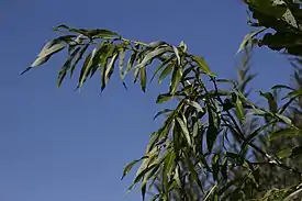 Прилистники косо-яйцевидные или почковидные, по краю железисто-зубчатые, длиной около 0,4—0,8 см. Листья ланцетные, заострённые, длиной до 10—12 см, шириной 0,7—3,2 см, по краю равномерно-железисто-пильчатые, сверху тёмно-зелёные, лоснящиеся, снизу сизые; молодые листья голые или вначале покрытые исчезающим пушком. Черешки длиной до 0,8 см.