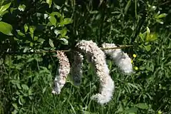 Серёжки сидячие или на короткой ножке с чешуйчатыми листочками при основании, мужские яйцевидные, длиной 1,5—2,5 см, шириной около 1 см, женские цилиндрические. Прицветные чешуи яйцевидно-продолговатые, тупые или острые, светло-бурые, на верхушке черноватые. Тычинки в числе двух, свободные, совершенно голые, с желтыми пыльниками и одним задним, продолговатым нектарником. Завязь яйцевидно-коническая; столбик в три раза короче завязи; рыльце цельное или на верхушке раздвоенное.