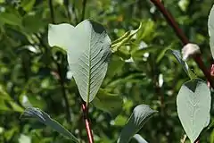 Почки продолговатые, желтоватые, покрытые редкими прижатыми волосками. Прилистники мелкие, полусердцевидные или широко-серповидные, железисто-зубчатые, быстро опадающие. Листья от эллиптических или обратнояйцевидиых до ланцетных и узколанцетных, длиной 4—9 см, шириной 2—4 см, с наибольшей шириной у середины или выше, на вершине острые, к основанию суженные или округлые, неглубоко и неравномерно зубчатые, иногда почти цельнокрайные, жестковатые, сверху блестящие, тёмно-зелёные, снизу сизо-беловатые или светло-зелёные.
