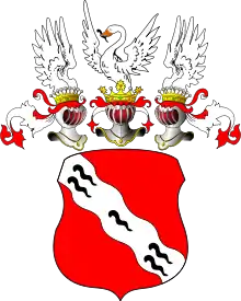 Щит четверочастный со щитом в середине. В первой и четвёртой, червлёных частях, серебряная волнообразная перевязь, обременённая пятью чёрными пиявицами, 2, 1, 2. Во второй и третьей, лазоревых частях, серебряный лебедь, держащий в клюве, чёрную пиявицу. В среднем, лазоревом щите, серебряная волнообразная перевязь, обременённая пятью чёрными пиявицами, 2, 1, 2. Щит увенчан Графскою короною и тремя Графскими шлемами: первый — украшен лазоревым и серебряным витком, а другие — дворянскими коронами. Нашлемники: первый — возникающий серебряный лебедь, держащий в клюве, чёрную пиявицу. Второй три страусовых пера, среднее — серебряное, а боковые — червлёные. Третий два буйволовых рога, пересечённые: первый — лазурью и серебром, второй — серебром и лазурью. Намёты: средний — справа лазоревый, с серебром, слева — червлёный, с серебром; правый намёт — червлёный с серебром, левый — лазоревый с серебром. Щит держат два серебряных льва с червлёными глазами и языками и с обращёнными головами.